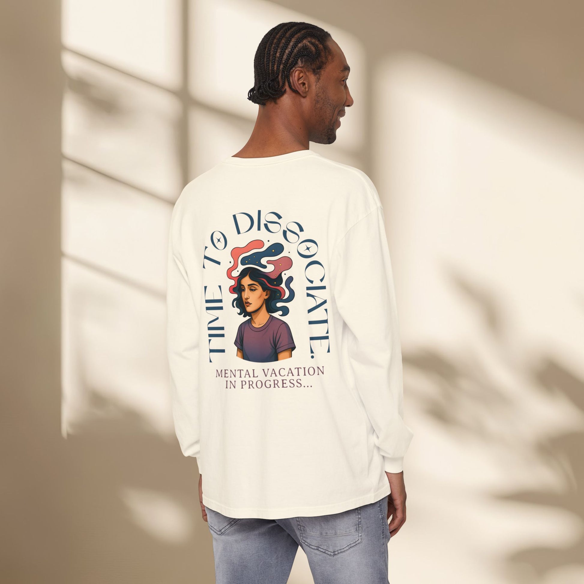 This Unisex Garment-dyed Long Sleeve T-Shirt features a unique design that captures the feeling of taking a mental vacation. Soft and comfortable, it is perfect for those looking to disconnect and relax. Ideal for adults seeking a cozy yet stylish look, this shirt is suitable for holidays, weekends, and casual outings. Product features - Double needle sleeve and bottom hems for durability - Ribbed-knit cuffs for shape retention - Neck and shoulder tape for stability - Garment-dyed fabric for a soft texture - 100% Ring spun cotton for printing quality Care instructions - Machine wash: cold (max 30C or 90F) - Do not bleach - Tumble dry: low heat - Iron, steam or dry: low heat - Do not dryclean